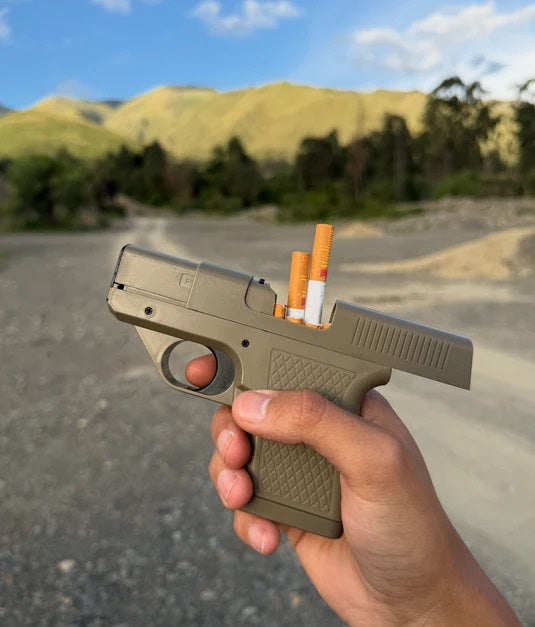 Load your cigarettes into the magazine, pull back the top like a real gun, and the chamber opens so you can grab a cigarette instantly